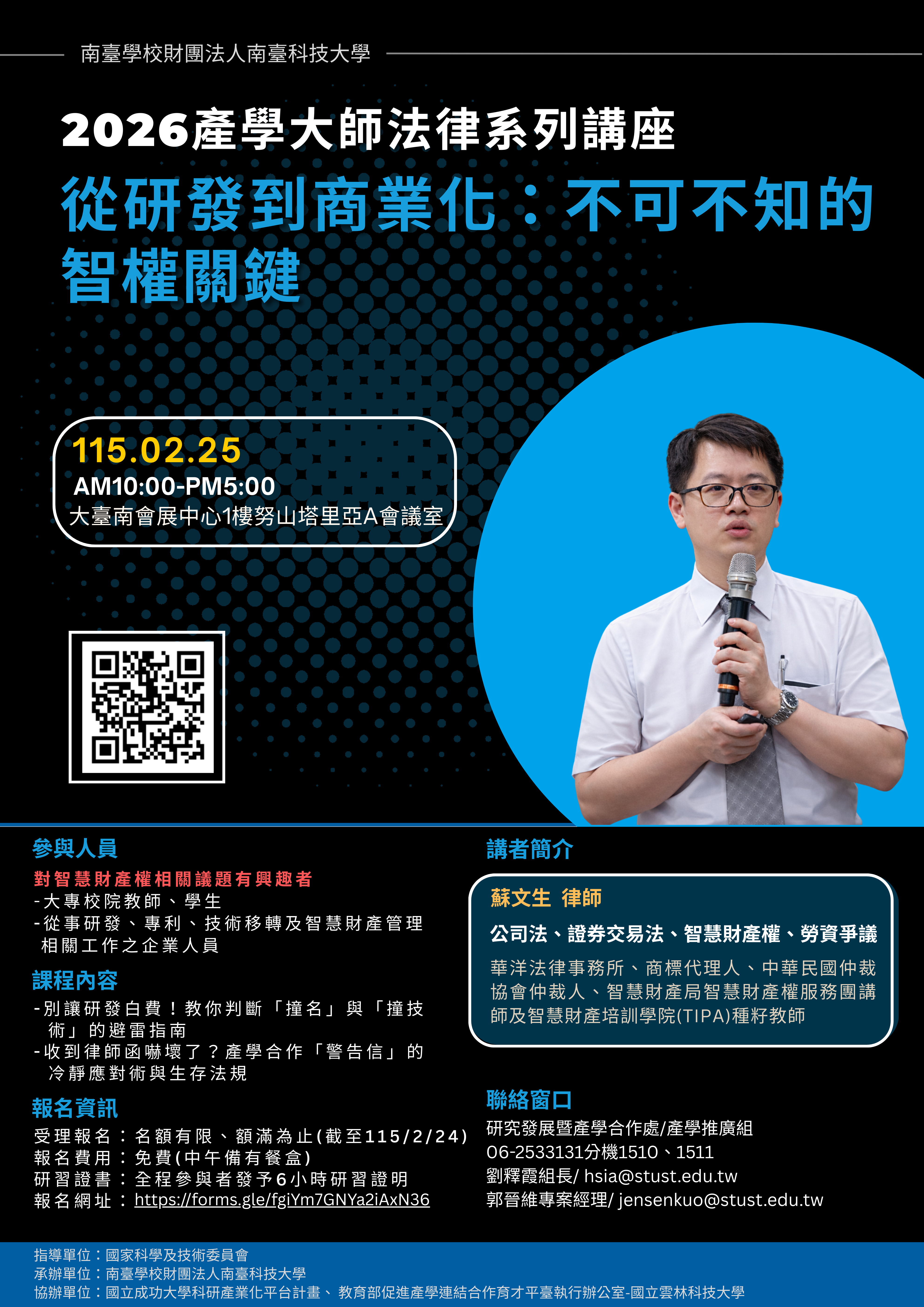 【活動轉知】南臺科技大學「2026產學大師法律系列講座-從研發到商業化:不可不知的智權關鍵」,敬邀貴校師生參與並協助公告,請查照。