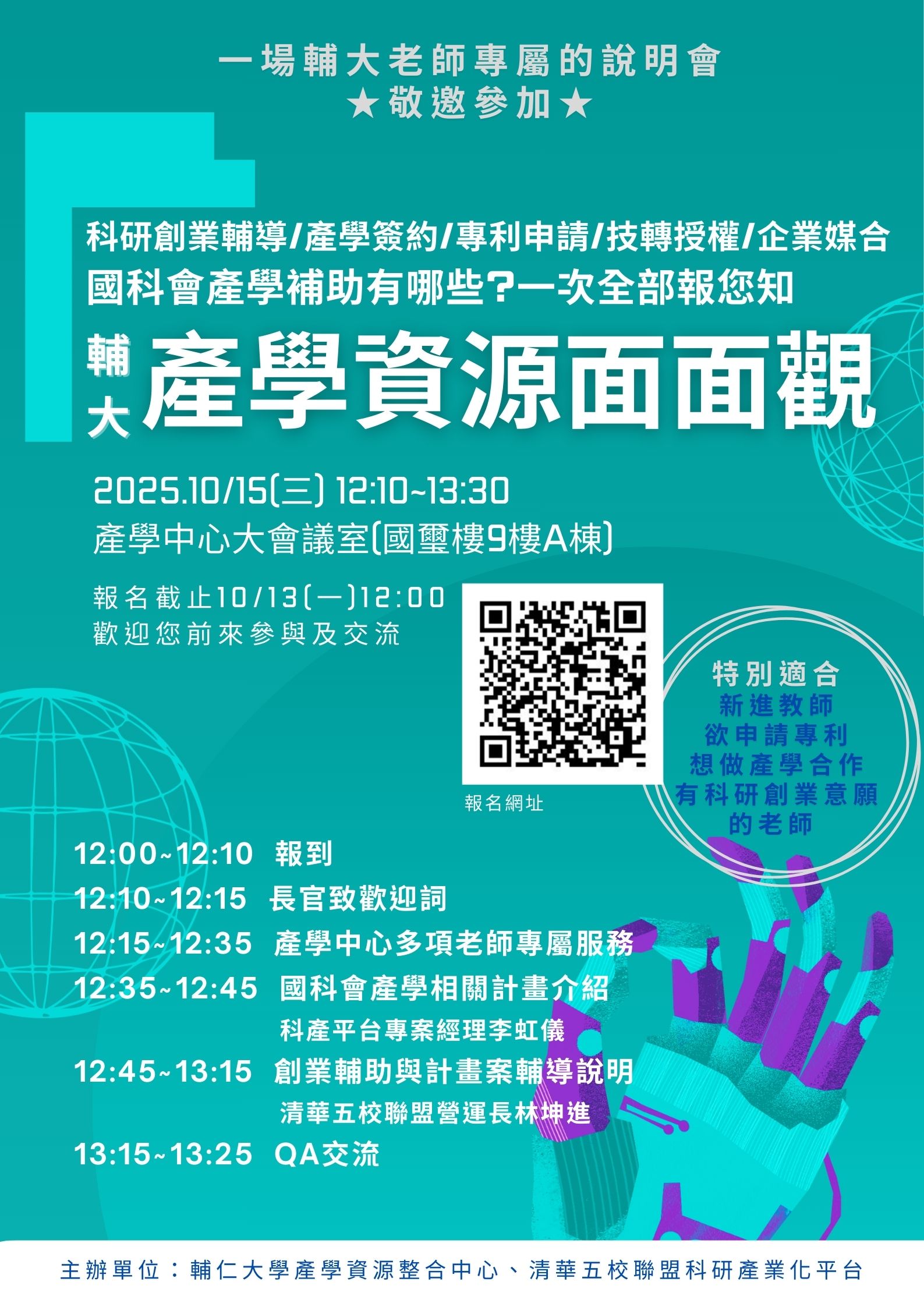 一、活動為提供產學資源整合中心的服務內容及國科會多項科創計畫說明,內容包含科研創業利多與補助、多元的國科會產學型態、簽約流程與眉角、專利申請&技轉授權必知等,提供給輔大教師們最新最完整的產學資訊。